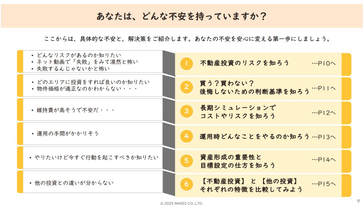 不動産投資の商品種類や仕組み、運用シミュレーションまで、初心者向けの「基礎知識」が詰まっています。